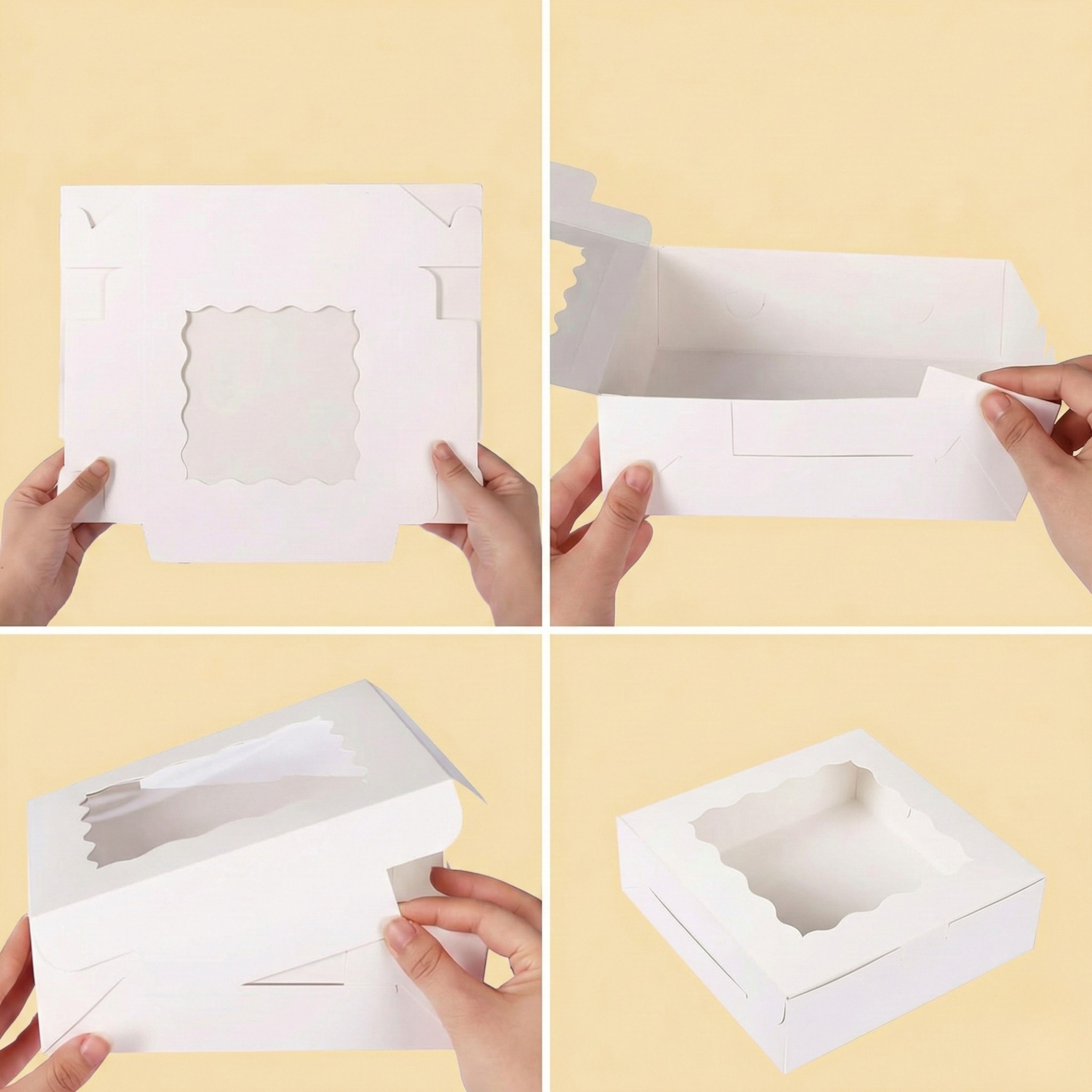 Pentru gogoși glazurate, brownies sau selecții de patiserie fină, vizibilitatea este totul. Această Cutie Prăjituri cu Fereastră Ondulată renunță la fereastra dreptunghiulară plictisitoare în favoarea unui design cu margini curbate, care atrage privirea exact spre centrul cutiei.